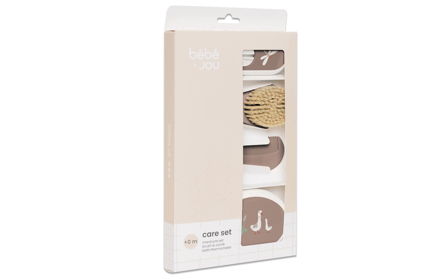 Een praktische verzorgingsset van bébé-jou om toekomstige ouders kado te geven. In deze set zit een kapset, manicureset en een badthermometer. Drie basisproducten die je nodig hebt voor een goede verzorging van je pasgeboren kindje.