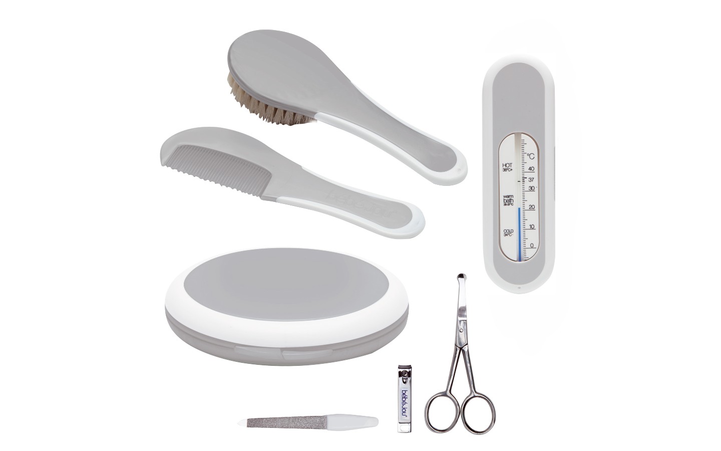 The beautiful gift set of bébé-jou is a perfect gift set in luxurious wrapping; ideal present for future parents. The gift set contains a brush and comb, baby manicure set and a bath thermometer. The brush has soft hair with special regard to the tender baby skin. The baby manicure set contains a file, nail clippers and stainless steel scissors. And the bath thermometer has a sunken thermometer tube which contains safe liquid. A gift set which is full coordinated and available in all bébé-jou designs.