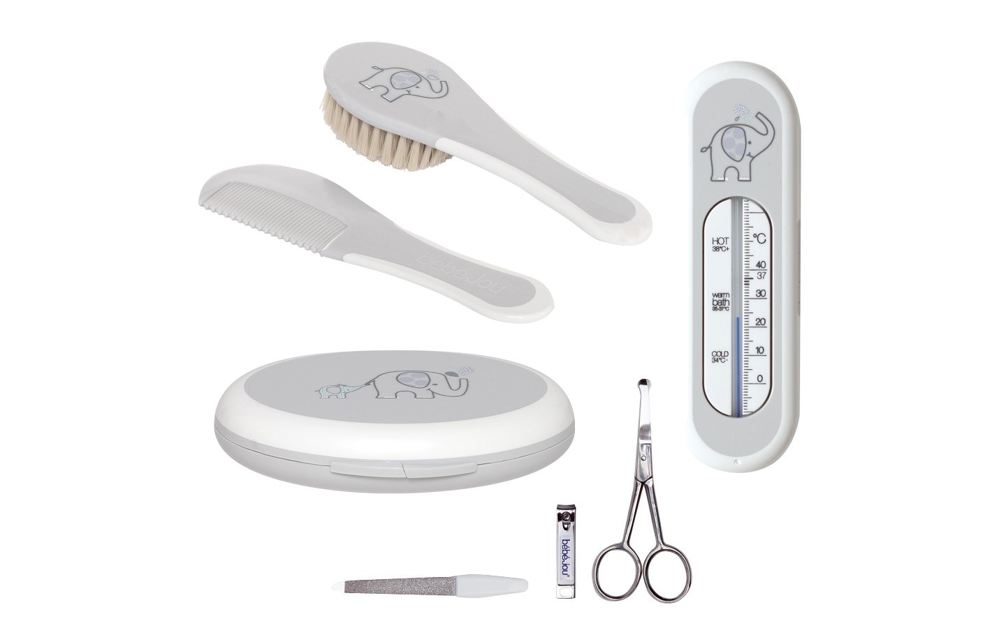 The beautiful gift set of bébé-jou is a perfect gift set in luxurious wrapping; ideal present for future parents. The gift set contains a brush and comb, baby manicure set and a bath thermometer. The brush has soft hair with special regard to the tender baby skin. The baby manicure set contains a file, nail clippers and stainless steel scissors. And the bath thermometer has a sunken thermometer tube which contains safe liquid. A gift set which is full coordinated and available in all bébé-jou designs.