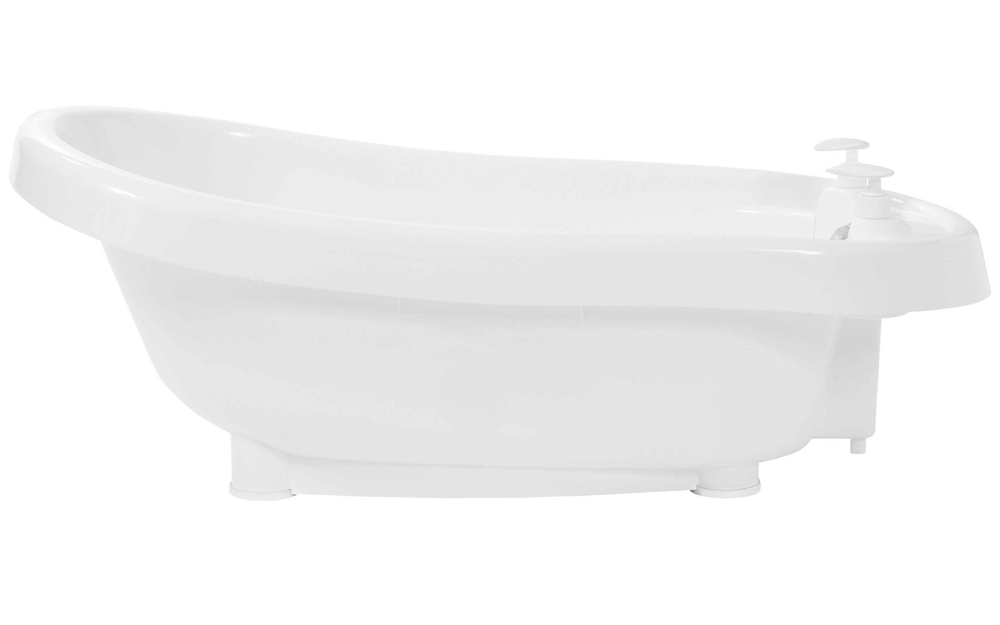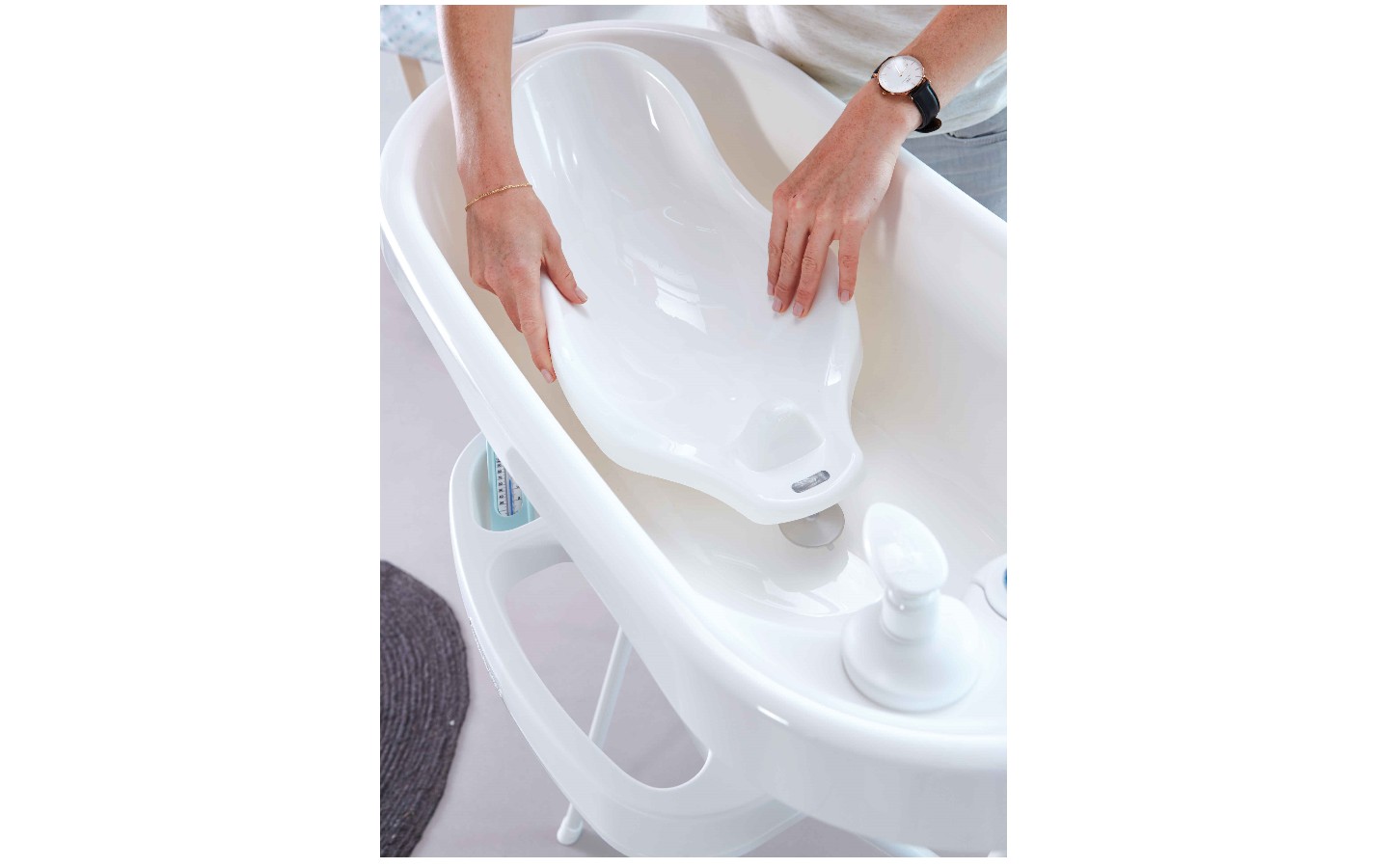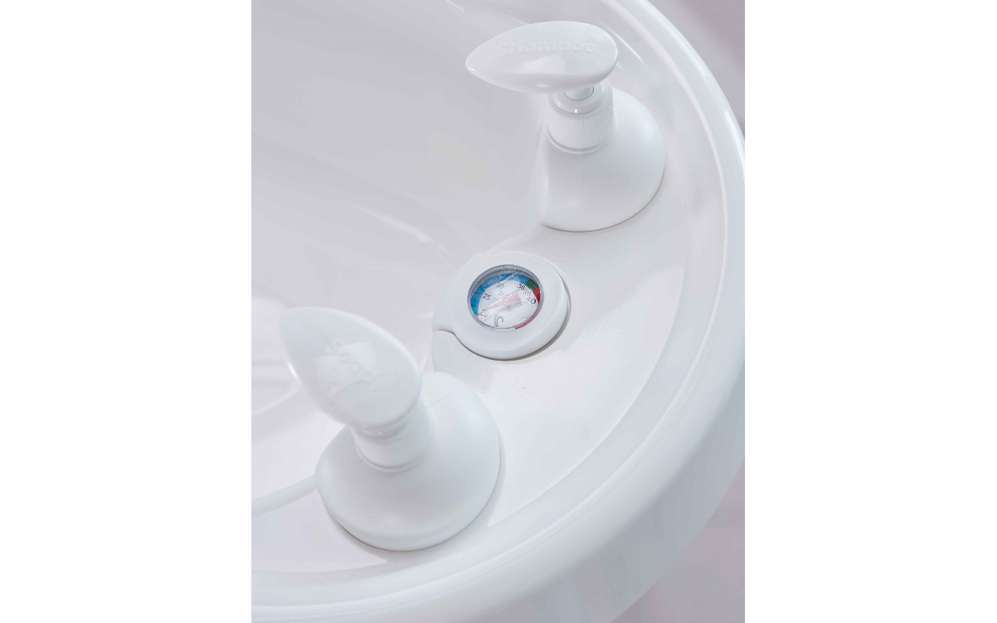 With the bébé-jou Thermo bath with our innovative “CLICK-system” you choose for safety and extra comfort during the bathing of your child. With the help of this innovative system you can easily and solidly place the bath with just “2 clicks” on the bébé-jou bath stand (2200 or 2205). The bath comes just as easily off the stand as it is placed on it, by squeezing the system on the bottom of the stand. This bath also comes with an integrated bath thermometer and two soap dispensers: one for shampoo and one for soap. A luxurious bath with everything you might need, so that you can optimally focus on your little one during bathing. The thermometer also functions as a plug, when it is pushed upwards the bath is slowly drained. The water can be caught in (for example) the bébé-jou nappy pail with the included drain hose. In this way heavy lifting will be avoided.