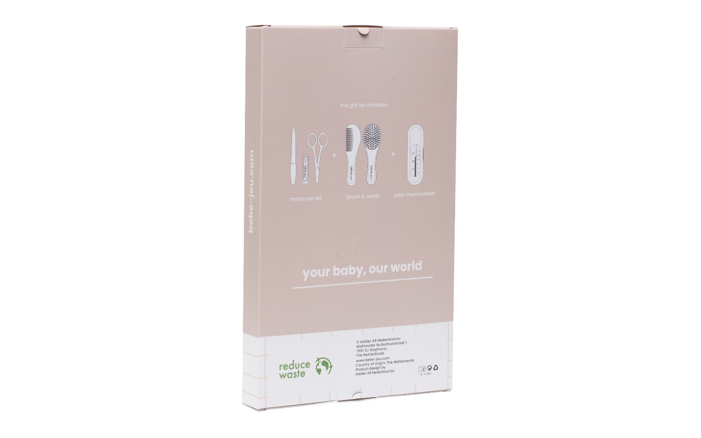 Un set de soins pratiques de bébé-jou à offrir aux futurs parents. Cet ensemble contient un set de coiffure, un set de manucure et un thermomètre de bain. Trois produits de base dont vous avez besoin pour prendre soin de votre nouveau-né.