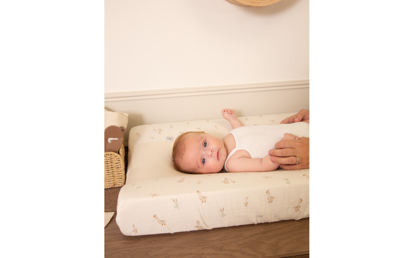 De jersey aankleedkussenhoes van bébé-jou biedt warmte en comfort aan je kleintje. De hoes heeft in de hoeken elastiek waardoor deze goed om het waskussen blijft zitten en is passend voor het bébé-jou aankleedkussen 72x44 cm. De aankleedkussenhoes is Oeko-Tex gecertificeerd en wasbaar op 40 graden.