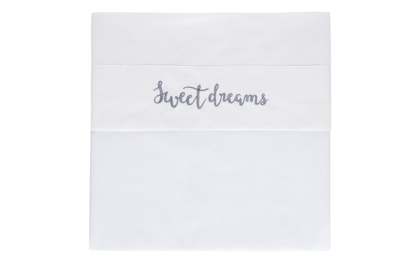 Het Sweet Dreams laken uit de Simply Fabulous collectie van bébé-jou is van 100% katoen gemaakt, dit maakt het heerlijk zacht en ademend. Het lakentje is wit en voorzien van de geborduurde tekst Sweet Dreams in het donker grijs, deze is dus makkelijk te combineren met elk dessin uit de Fabulous collectie. Maak het setje compleet met de ledikantdeken en het hoeslaken uit dezelfde collectie. Doorslapen kunnen we niet beloven maar aan het beddengoed zal het niet liggen! Het ledikantlaken is 100*150 cm, dit product is ook verkrijgbaar in wiegmaat. TOG-waarde 0,1.