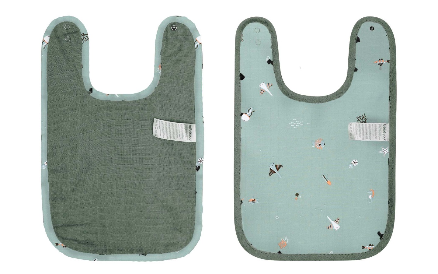 Set van 2 bébé-jou slabbers. De slabs hebben een handige sluiting met drukknopen en hoef je dus niet over het hoofdje van je kleintje te trekken. De slabbers hebben een groot formaat en een hippe print. Alle badstofartikelen van bébé-jou zijn Oeko-Tex gecertificeerd en wasbaar op 40 graden.