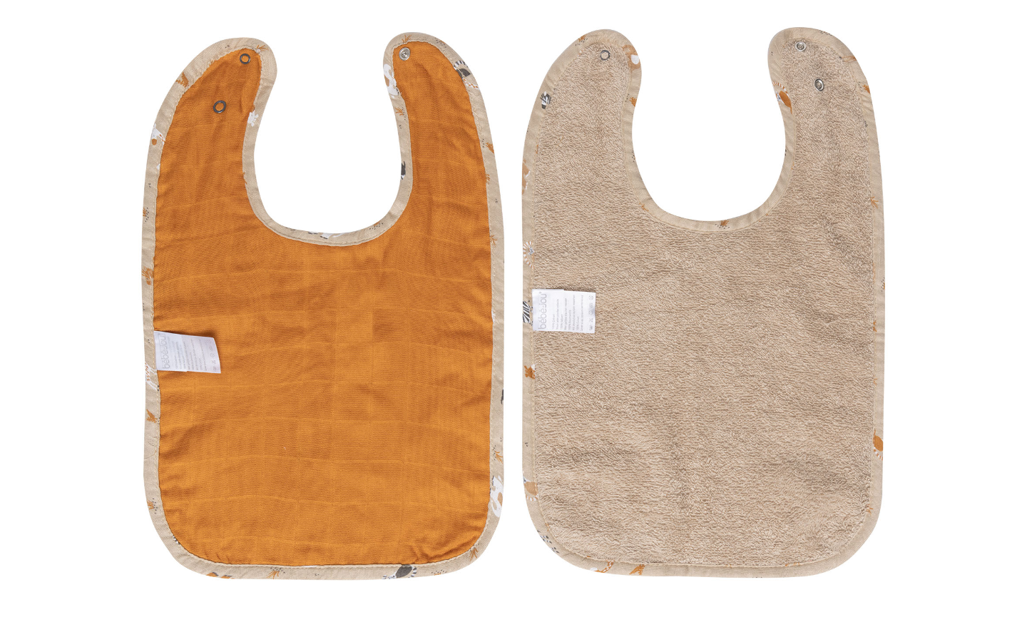 Set van 2 bébé-jou slabbers. De slabs hebben een handige sluiting met drukknopen en hoef je dus niet over het hoofdje van je kleintje te trekken. De slabbers hebben een groot formaat en een hippe print. Alle badstofartikelen van bébé-jou zijn Oeko-Tex gecertificeerd en wasbaar op 40 graden.