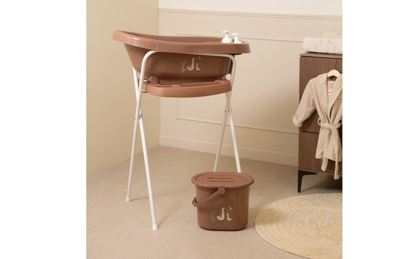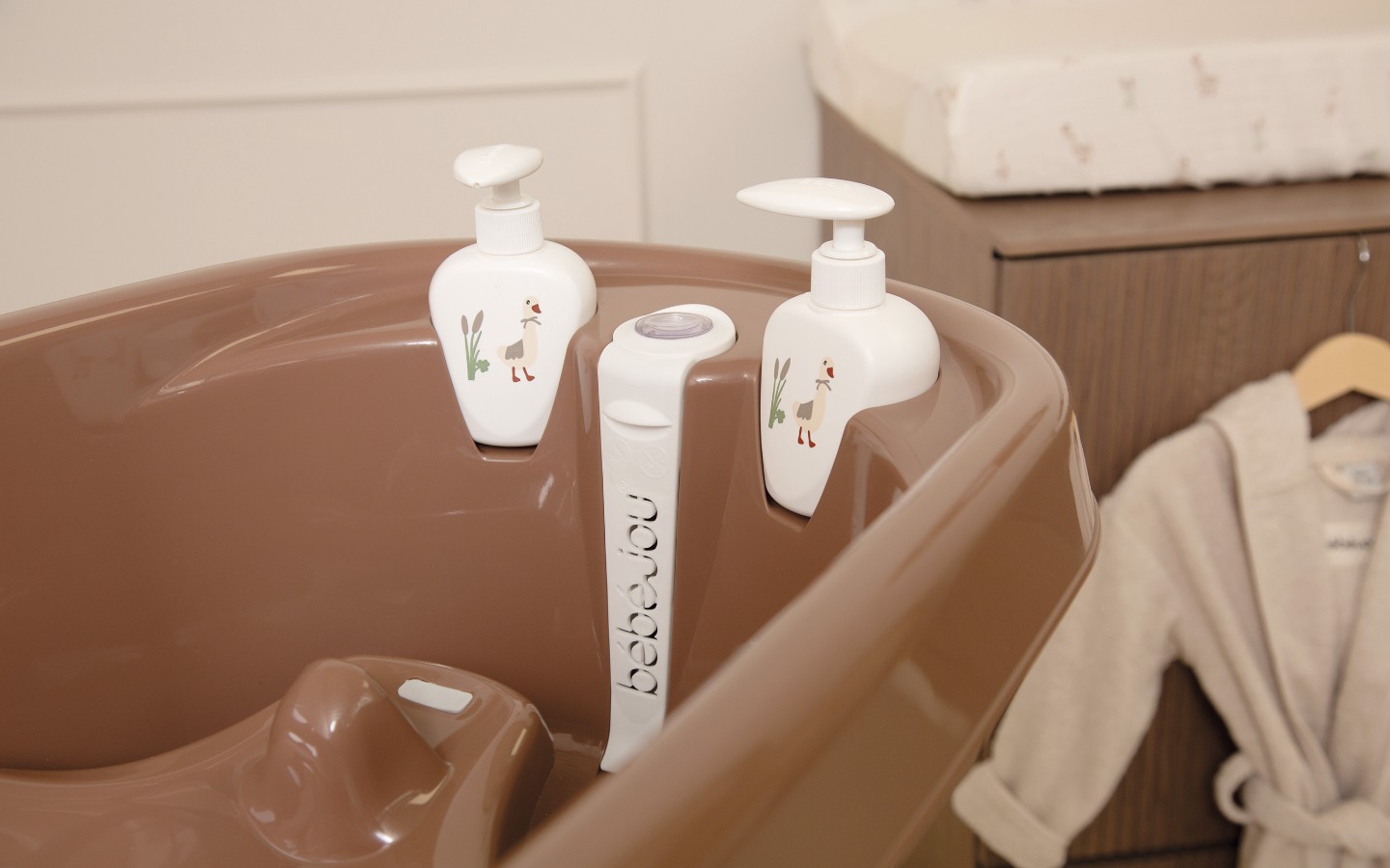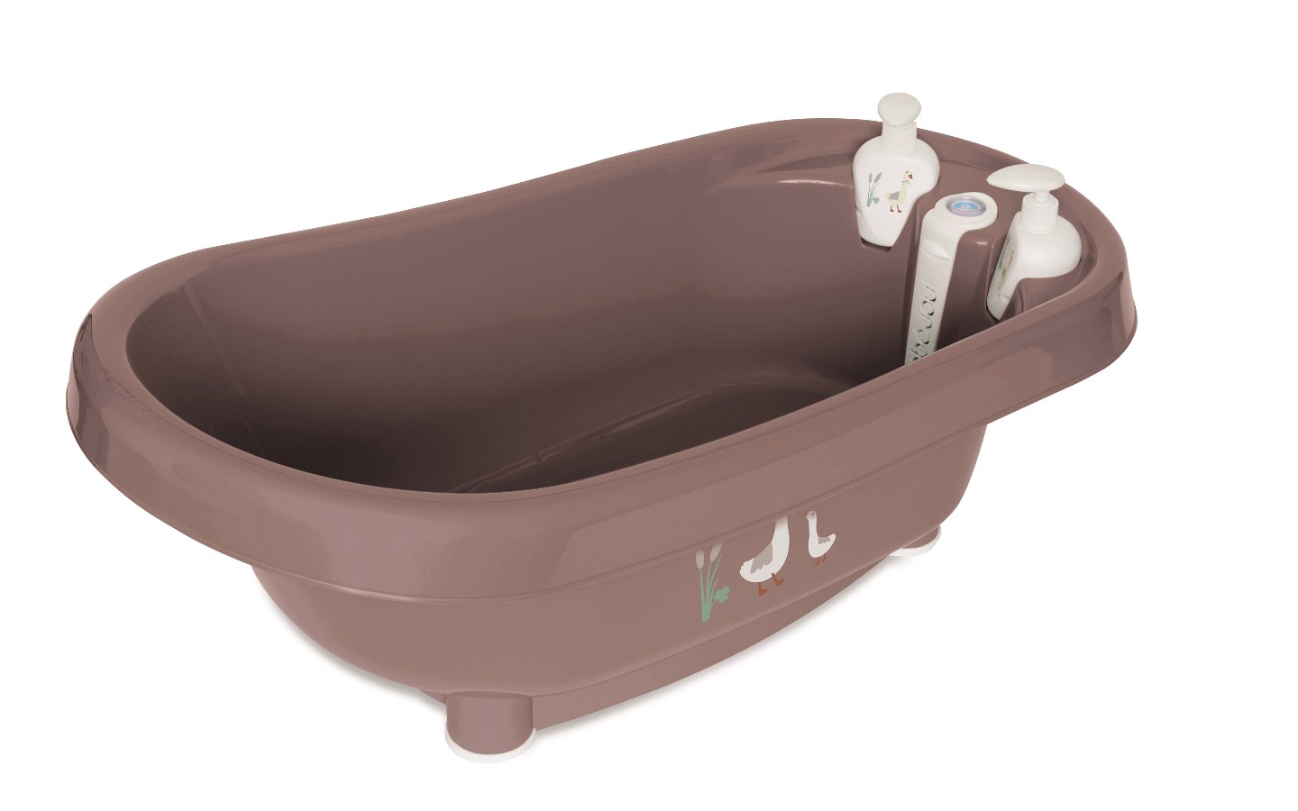 Het thermobad click is een ovaalvormig badje met vlak zitgedeelte. Aan één kant loopt het badje schuin af waardoor je je kindje comfortabel in het badje kunt doen. Het badje heeft een geintregeerde thermometer die tevens funcioneert als badstop.